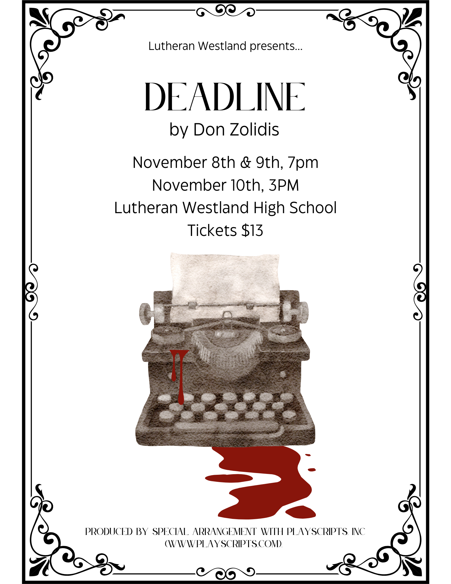 Join us as the Lutheran Westland Theater plans to impress audiences with three performances of Deadline. Show dates are Friday, November 8th, Saturday, November 9th at 7pm, & Sunday November 10th at 3pm. Tickets are $13 online and children under 5 are free. Doors open at 6:30pm & concessions will be available.